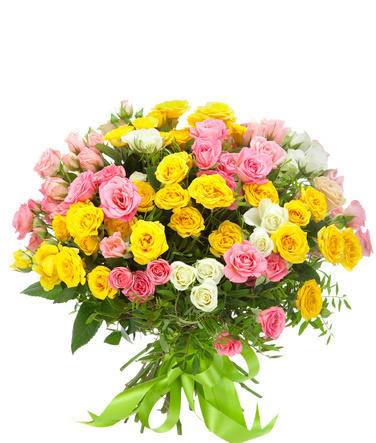 «Праздничный» букет состоит из разноцветных кустовых роз. Среди них присутствуют изысканные белые, яркие желтые и нежные розовые оттенки цветов, благодаря чему композиция выглядит невероятно красочно и привлекательно. Использование зелени писташа придает дополнительной эффектности и свежести. Такой букет отлично подойдет для выражения глубоких чувств искренности и уважения, а также поздравления близких людей с особыми праздниками.